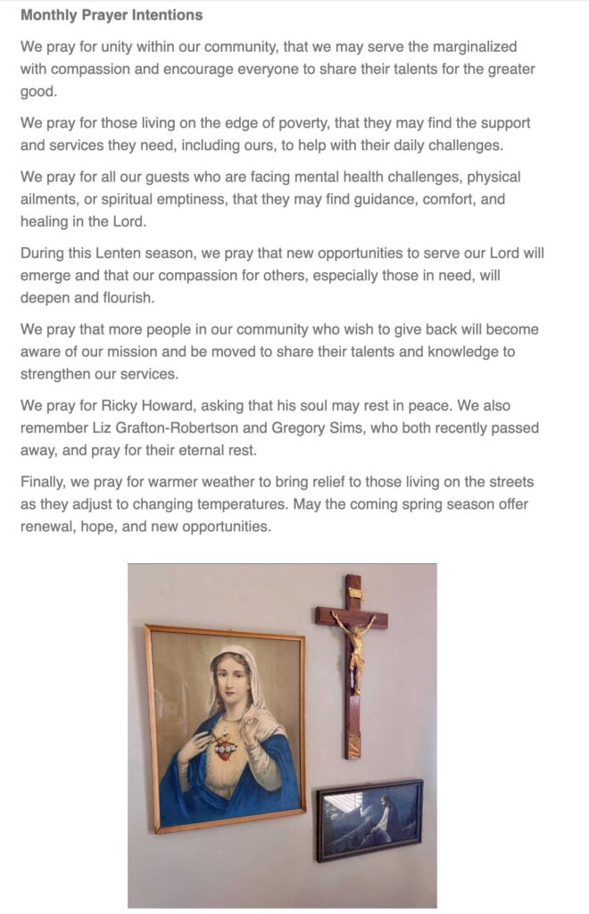 One of our regular hospitality volunteers, Laura Martin, once shared a comment that deeply resonated with us: “Every person who enters the doors of Romero House is the face of Jesus.” Is Jesus the elderly gentleman who lives in his vehicle and arrives late each afternoon for our hospitality? Is he the middle-aged woman who comes to Ames Romero House (ARH) daily to eat and take a shower?